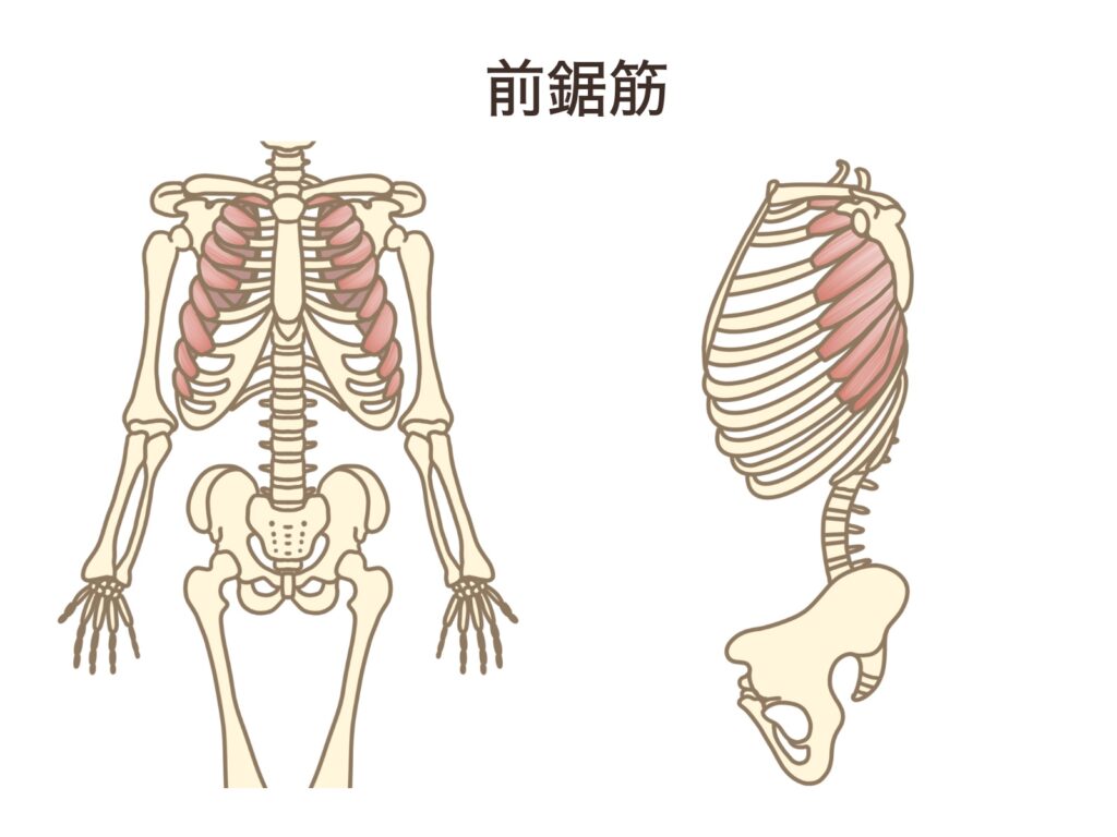 前鋸筋は肋骨から肩甲骨の内側へ向かって走る筋肉で、肩甲骨を胸郭に固定する重要な役割を担います。ボクシングのパンチ動作で肩甲骨が前に出るのは、この筋肉の働きによるものです。